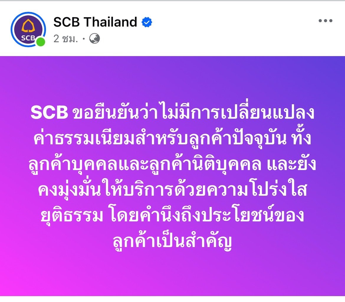 ทั้งนี้ ข้อมูลที่ถูกเผยแพร่เป็นการแจ้งอัตราค่าธรรมเนียมของบริการ SCB Business Anywhere ล่วงหน้าไปยังกลุ่มลูกค้านิติบุคคลที่สมัครใหม่ ซึ่งเป็นการแจ้งล่วงหน้าก่อนที่จะมีการเรียกเก็บค่าธรรมเนียมตามหลักเกณฑ์ทางการที่เกี่ยวข้อง โดยไม่มีผลกระทบกับลูกค้าปัจจุบันแต่อย่างใด