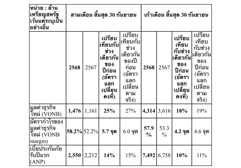 •มูลค่าธุรกิจใหม่(VONB)เติบโตร้อยละ25คิดเป็น1,476ล้านเหรียญสหรัฐทำสถิติสำหรับไตรมาสที่สาม