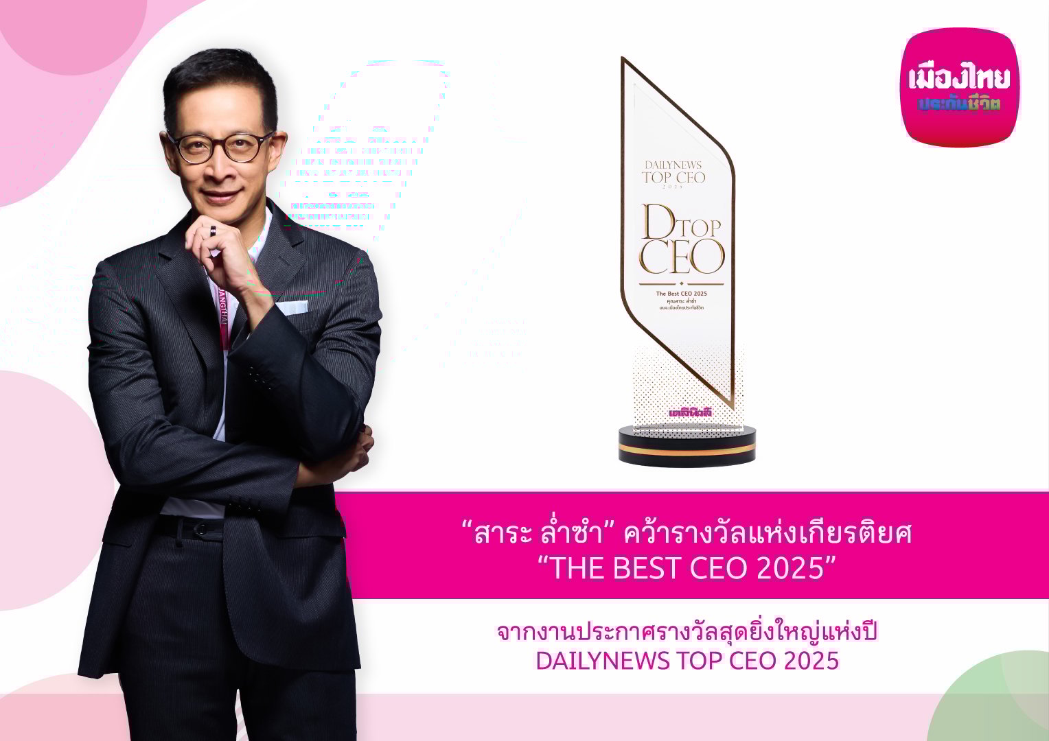 “สาระ ล่ำซำ” คว้ารางวัลเกียรติยศ “THE BEST CEO 2025” ต่อเนื่องเป็นปีที่ 2 จากเวทีประกาศรางวัลยิ่งใหญ่แห่งปี DAILYNEWS TOP CEO 2025